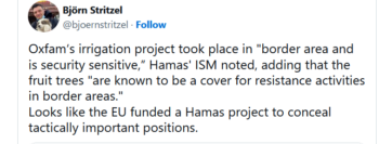En décembre, il tentait d’entacher la réputation d’Oxfam, l’organisation de lutte contre la pauvreté, à propos d’un projet d’irrigation et de culture fruitière à Gaza, projet qui avait reçu le soutien financier de l’Union européenne. Citant un document de provenance douteuse, Stritzel concluait : « On dirait que l’UE a financé un projet du Hamas visant à dissimuler d’importantes positions tactiques » [derrière des arbres fruitiers].
