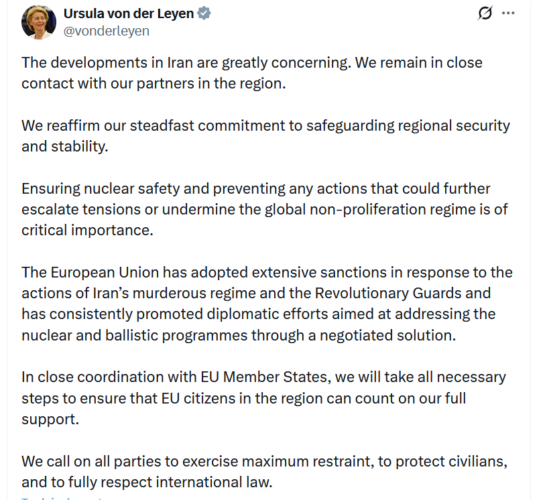 Israël et les EU ont mené une attaque sans la moindre provocation. Pourtant, on ne pouvait trouver ce détail nulle part dans le premier message publié samedi dans les médias sociaux par la présidente de la Commission européenne.